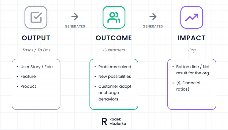 Poniżej znajduje się grafika, która bazuje na tej z artykułu Output vs Outcome vs Impact Christophe’a Achouiantza.