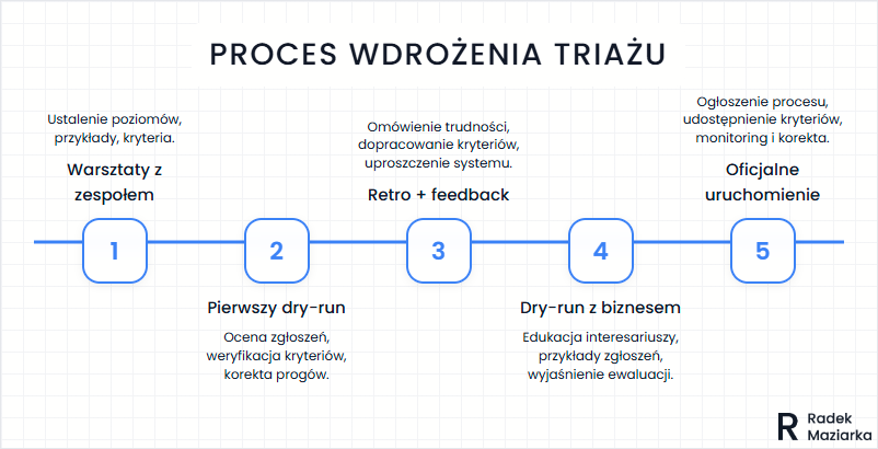 To kluczowy moment. Interesariusze muszą zrozumieć, że nie wszystko może być Critical. Że są obiektywne kryteria. Że Low nie oznacza “nieważne”, tylko “może poczekać”.