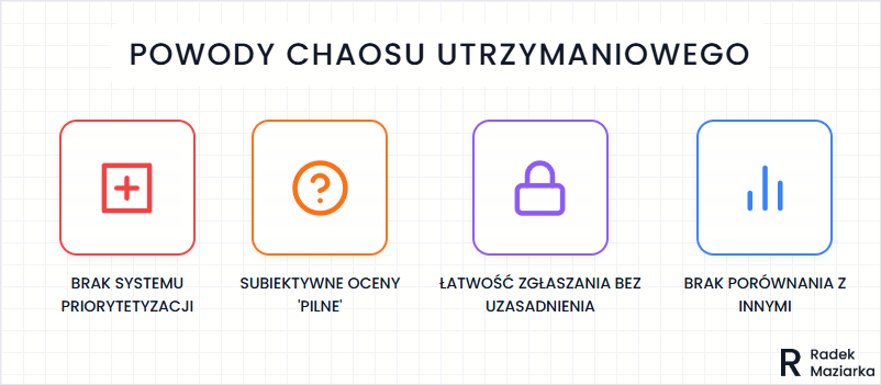 To właśnie ta praca utrzymaniowa zjada większość czasu zespołu. Awarie, bugi, pytania o konfigurację, drobne poprawki. Niektóre zgłoszenia przychodzą z zewnątrz, inne generujemy sami.