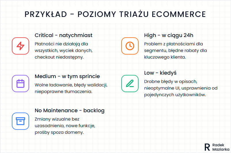 Każdy poziom ma jasno zdefiniowane kryteria. Zespół wie, że Critical oznacza natychmiastową reakcję. Low może poczekać do kolejnego sprintu. No Maintenance - przekierowujemy do Product Managera.